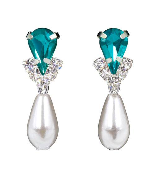 #5538BZS - Rhinestone Pear V Pearl Drop Earrings - Blue Zircon Silver